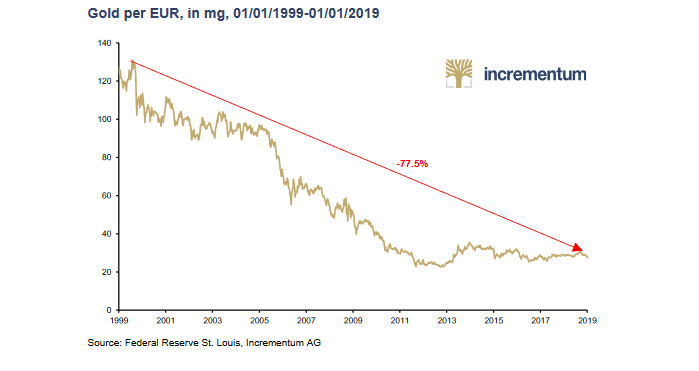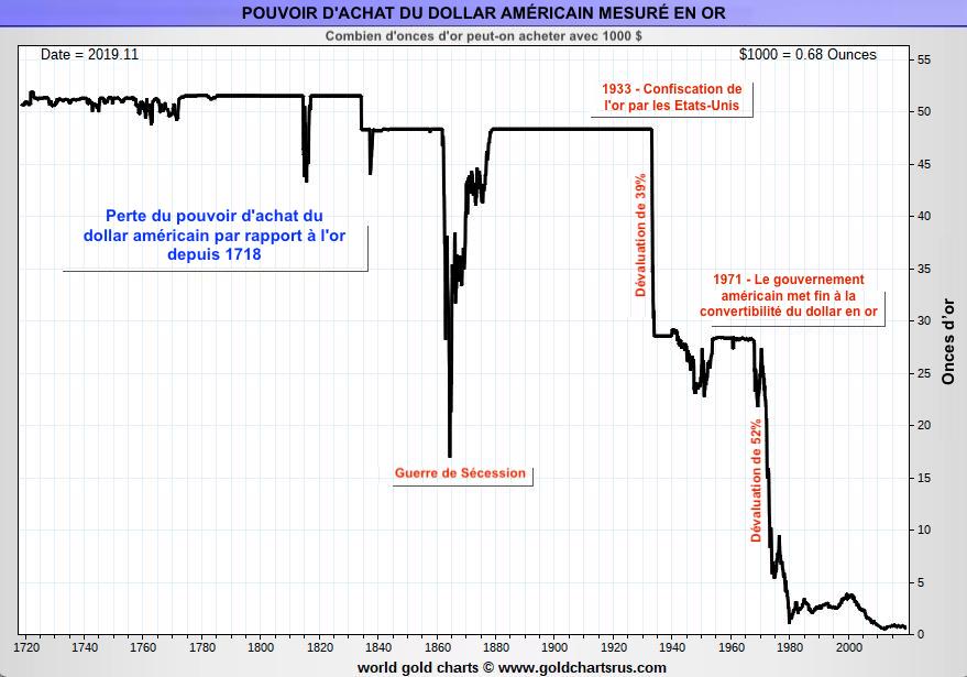 En effet, l’or est un métal monétaire qui a prouvé depuis plusieurs millénaires sa capacité à constituer une réserve de valeur. Le pouvoir d’achat de l’or est stable sur le long terme contrairement à celui des monnaies fiducières (euros, dollars). L’or ne peut pas être imprimé, sa performance reflète en réalité la baisse du pouvoir d’achat des monnaies.