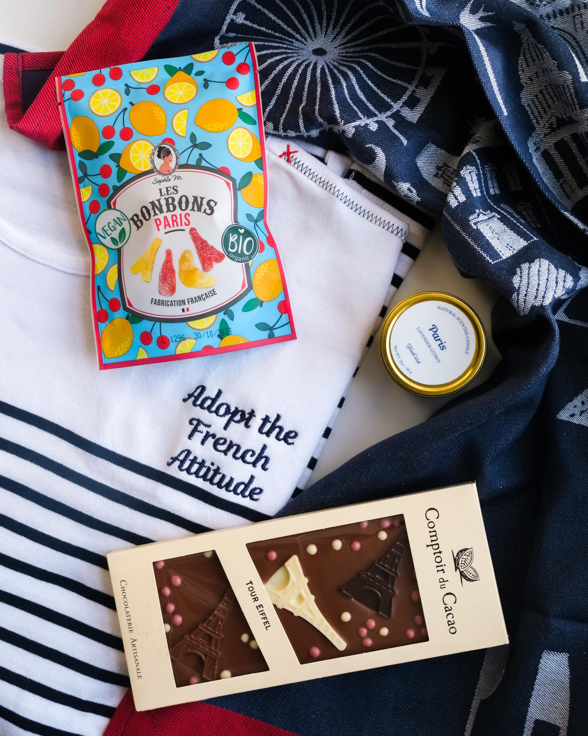 La boîte cadeau contient une superbe marinière “Adopt the French Attitude” (disponible dans la version VIP) 100% coton conçue spécialement pour French Wink par Bragard Inc., une tablette de chocolat Comptoir du Cacao (chocolat noir ou au lait), des bonbons mous vegan en forme de tour Eiffel importés de France, le chiffon « Paris Heart », et une bougie aux notes florales et citronnées.
